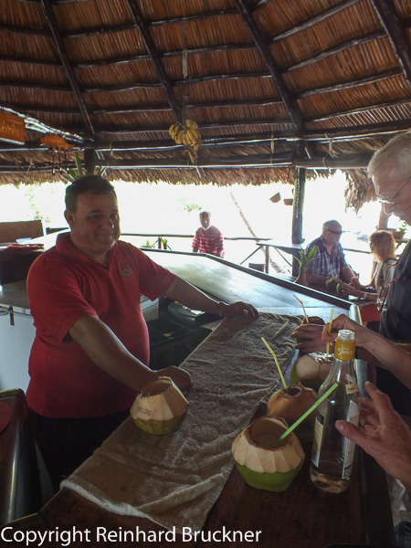 Wir umrunden die Insel auf einem Holzbohlensteg , beobachten mehrere Vogelarten und bewundern bühende Bananenpflanzen. Am Ende gelangen wir zu einer Bar, wo es aus ausgehöhlten Kokosnusschalen Kokosmilch zu trinken gibt.