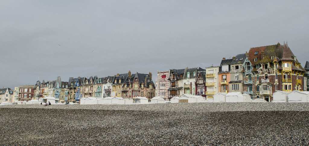 und lade mir aus dem Netz die Karten der gesamten Normandie für die OsmAnd-App herunter. Nun haben wir also auch ein funktionierendes Navi. Da gerade so ziemlich tiefste Ebbe ist, kann ich relativ weit auf den Kiesstrand raus laufen und mehrere Aufnahmen machen, die ich zu einem Pano zusammen gesetzt habe:
