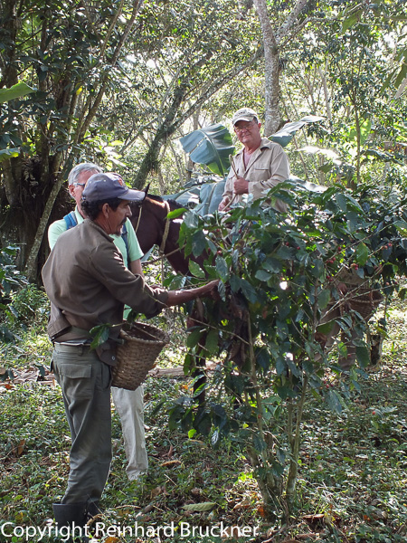 Zunächst geht es durch eine Kaffeeplantage, in der Bauern beim Ernten der roten Kaffeebohnen sind. Ein “Vorarbeiter” auf einem Pferd kontrolliert sie. Yuni erklärt, dass die Frauen, die wir sehen, ausnahmsweise heute aus der Stadt gekommen sind und mithelfen, weil Sonntag ist.