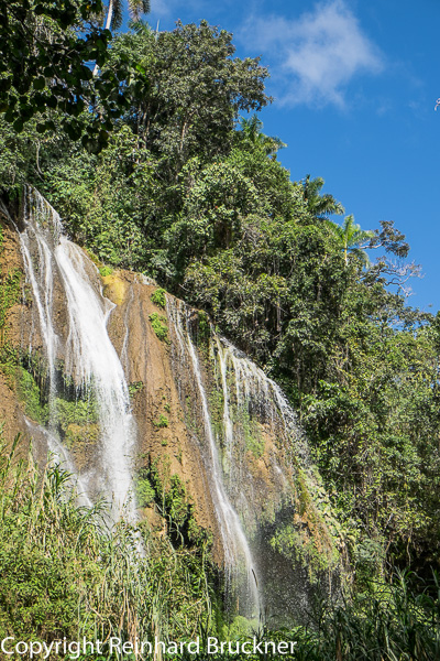 Wir fahren zunächst zum nahegelegenen Kaffee-Museum. Nach Yunis Aussage gedeiht hier im Gebirge der beste Kaffee Kubas, eine Arabica-Sorte. Wir besichtigen die diversen historischen Werkzeuge, die in zwei Hütten ausgestellt sind und genießen dann an der Bar einen frisch gebrühten “echten” Arabica. Der Geschmack überzeugt. Dann geht es auf den Trucks etwa eine halbe Stunde durch die wunderbare Berglandschaft, vorbei an armseeligen Bauernhäuschen und kleinen Kaffee- und Bananenplantagen. Wir erreichen den Anfang eines Wanderweges und verlassen die Trucks. Drei Teilnehmer, die etwas schlecht zu Fuß sind bleiben zurück und wir beginnen unsere Wanderung.